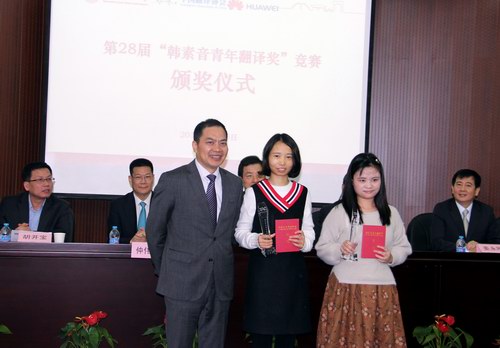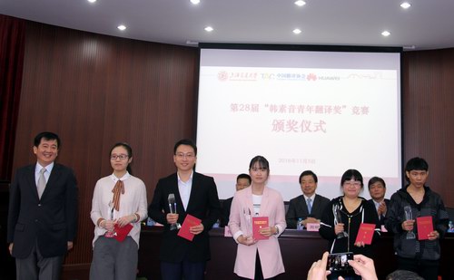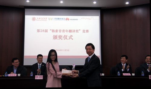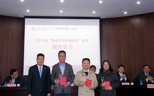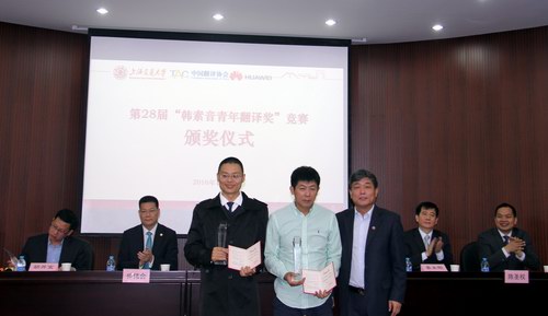2016年11月5日,由中國翻譯協(xié)會(huì)主辦、《中國翻譯》編輯部和上海交通大學(xué)外國語學(xué)院聯(lián)合承辦的第二十八屆韓素音青年翻譯獎(jiǎng)競賽頒獎(jiǎng)典禮在上海交通大學(xué)舉行。中國翻譯協(xié)會(huì)會(huì)長、中國外文局局長、中國翻譯研究院院長周明偉,上海交通大學(xué)副校長張安勝出席頒獎(jiǎng)典禮并致辭;中國譯協(xié)常務(wù)副秘書長、中國外文局國際合作部主任姜永剛,中國譯協(xié)副會(huì)長、華為技術(shù)有限公司翻譯中心主任陳圣權(quán)、上海交通大學(xué)外國語學(xué)院院長胡開寶,以及來自全國各地的獲獎(jiǎng)選手代表和嘉賓出席頒獎(jiǎng)典禮。本屆競賽共評(píng)選出英譯漢一等獎(jiǎng)2名、二等獎(jiǎng)5名、三等獎(jiǎng)6名、優(yōu)秀獎(jiǎng)70名;漢譯英一等獎(jiǎng)空缺、二等獎(jiǎng)3名、三等獎(jiǎng)8名、優(yōu)秀獎(jiǎng)24名(詳細(xì)名單參加本網(wǎng)站消息和《中國翻譯》2016年第6期)。