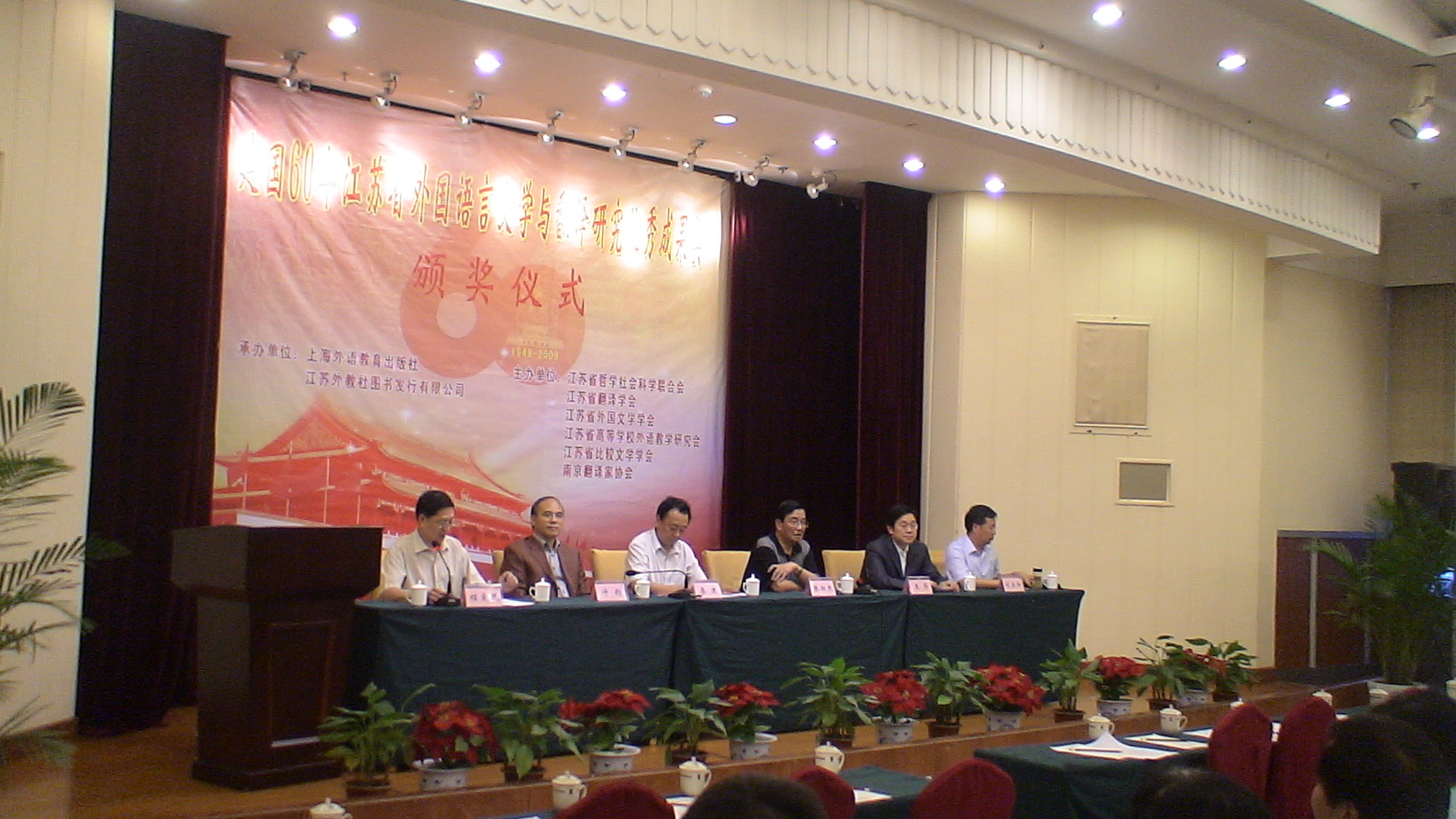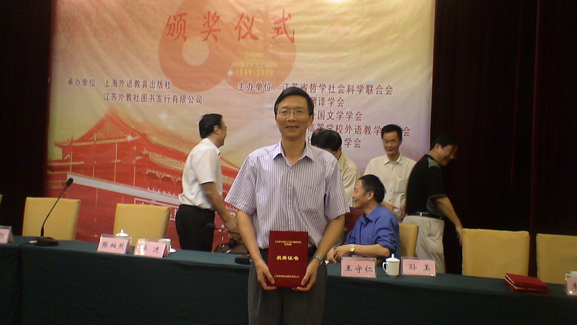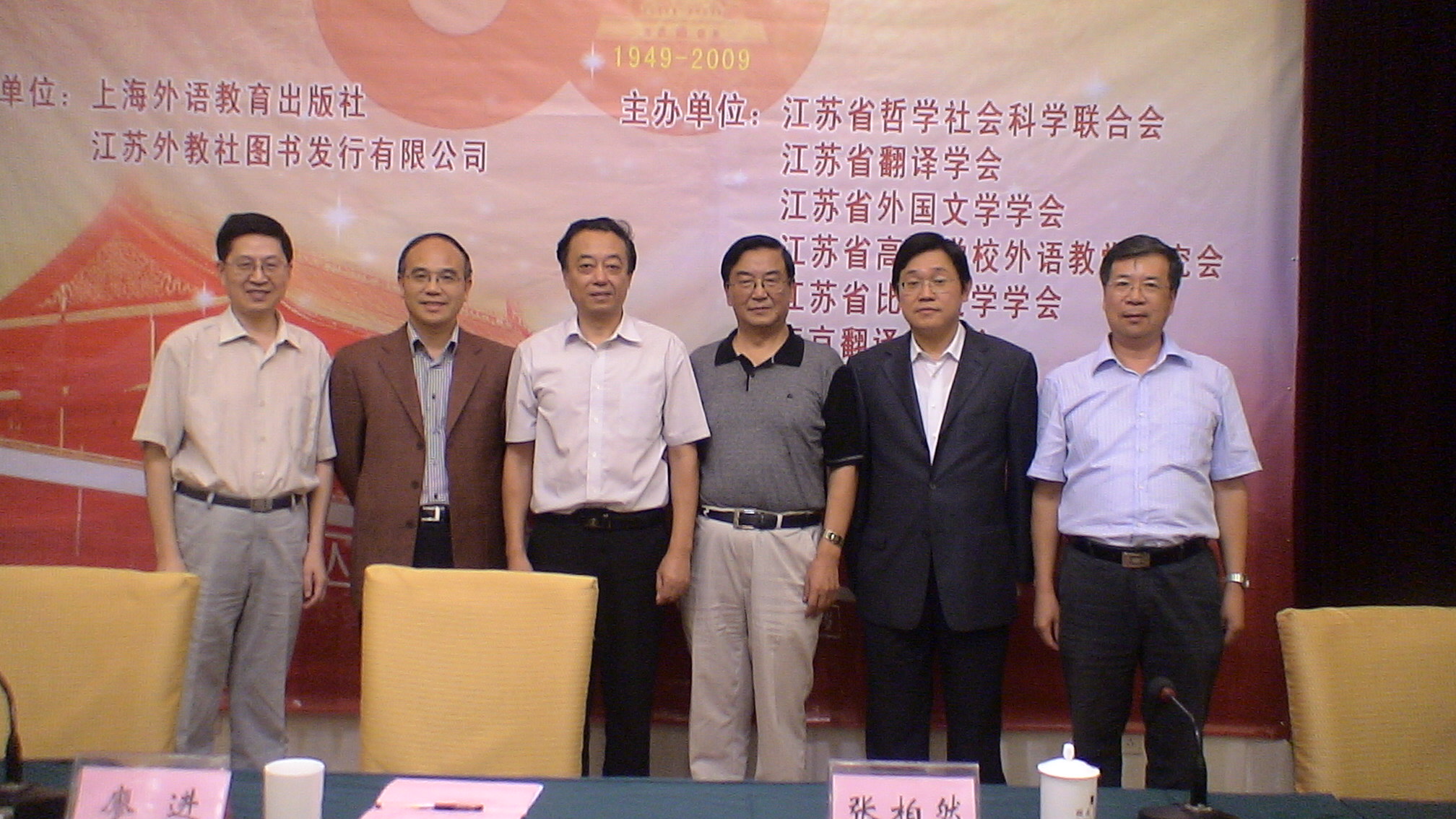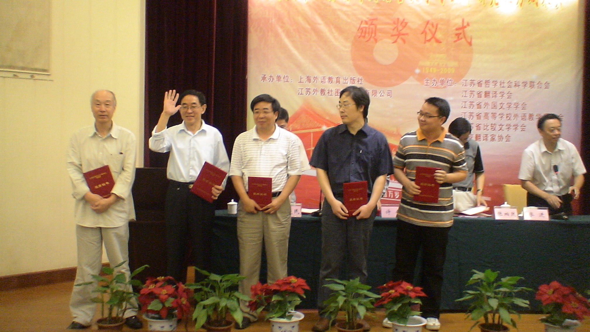 2009年9月27日,由江蘇省哲學社會科學界聯合會、江蘇省翻譯協(xié)會、江蘇省外國文學學會、江蘇省高等學校外語教學研究會、江蘇省比較文學學會和南京翻譯家協(xié)會共同主辦,由上海外語教育出版社承辦的“中華人民共和國成立60周年江蘇省外國語言文學與翻譯研究優(yōu)秀成果獎”評選結果揭曉,作為江蘇外語界對新中國60華誕的一份獻禮。頒獎活動在東南大學隆重舉行。來自江蘇省內高校的外語界專家和獲獎代表150多人參加了頒獎活動。