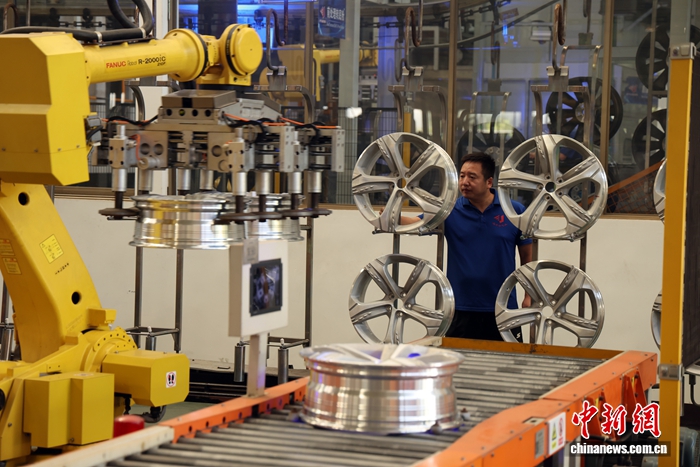 資料圖:浙江今飛凱達輪轂股份有限公司工作人員在生產線上檢查輪轂質量情況。中新社發 毛建軍 攝