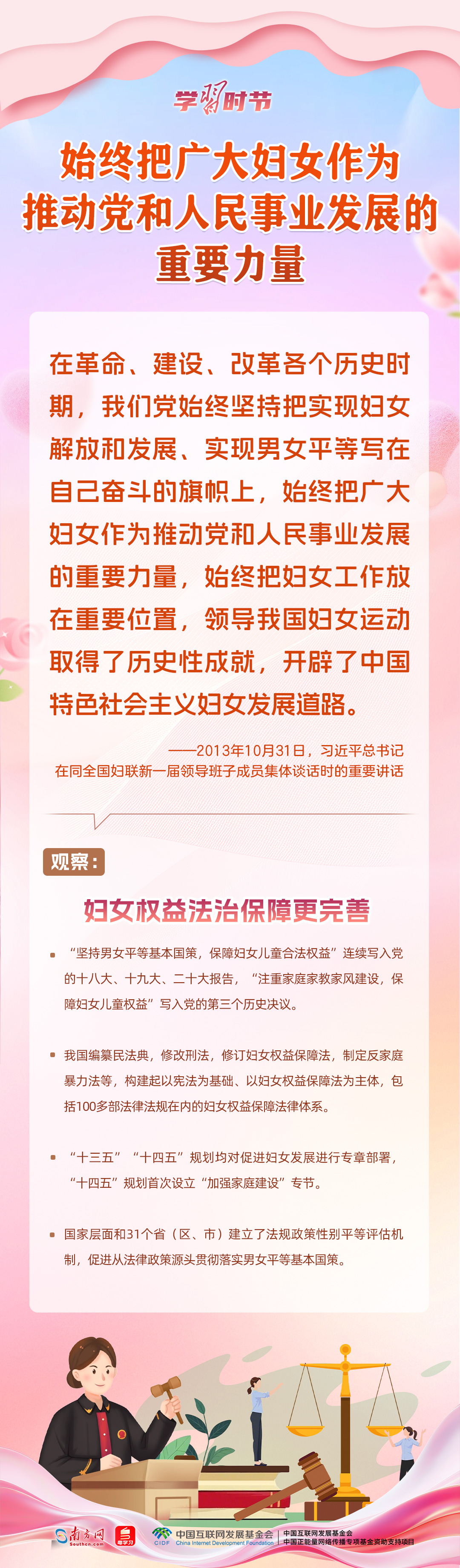 婦女是人類文明的開創者、社會進步的推動者,在各行各業書寫著不平凡的成就。黨的十八大以來,習近平總書記關心關懷婦女全面發展、謀劃部署推進婦女工作,激勵億萬婦女在實現中華民族偉大復興的新征程上昂首向前、奮斗逐夢。今天的中國,廣大婦女作為時代的書寫人、追夢的奮斗者,不僅擁有更加平等的社會地位,也擁有更加遼闊的發展空間,中國特色社會主義婦女發展道路越走越寬廣。
