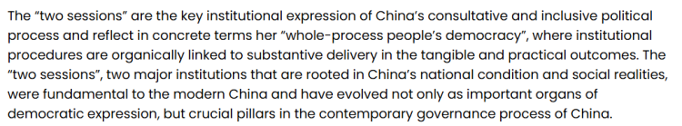 文章指出,中國的全過程人民民主植根于中國的國情與社會現實,在現代中國國家治理體系中發揮著重要作用。兩會不僅是表達社會意見、形成政策共識的重要平臺,更是中國當代治理體系中的關鍵支柱。
