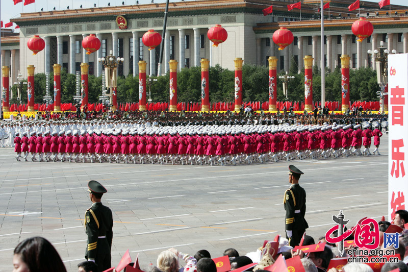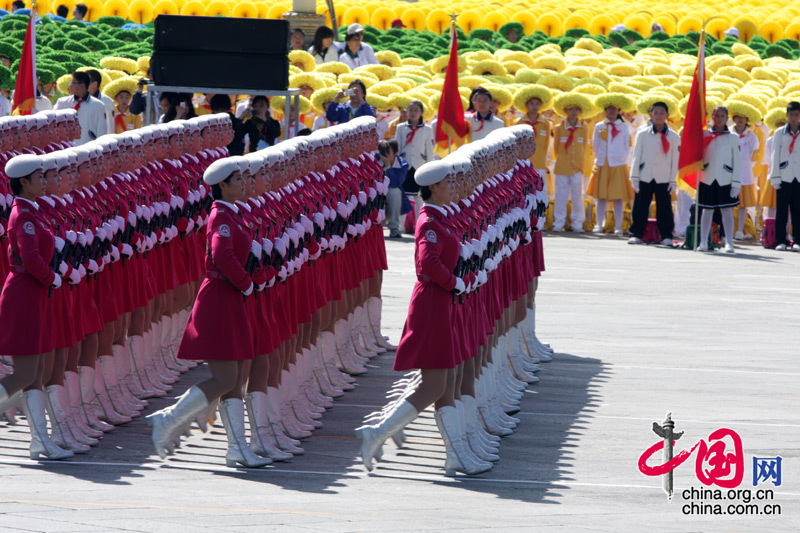 10月1日,首都各界慶祝中華人民共和國成立60周年大會在北京舉行。這是女民兵方隊通過天安門廣場。中國網/胡迪攝