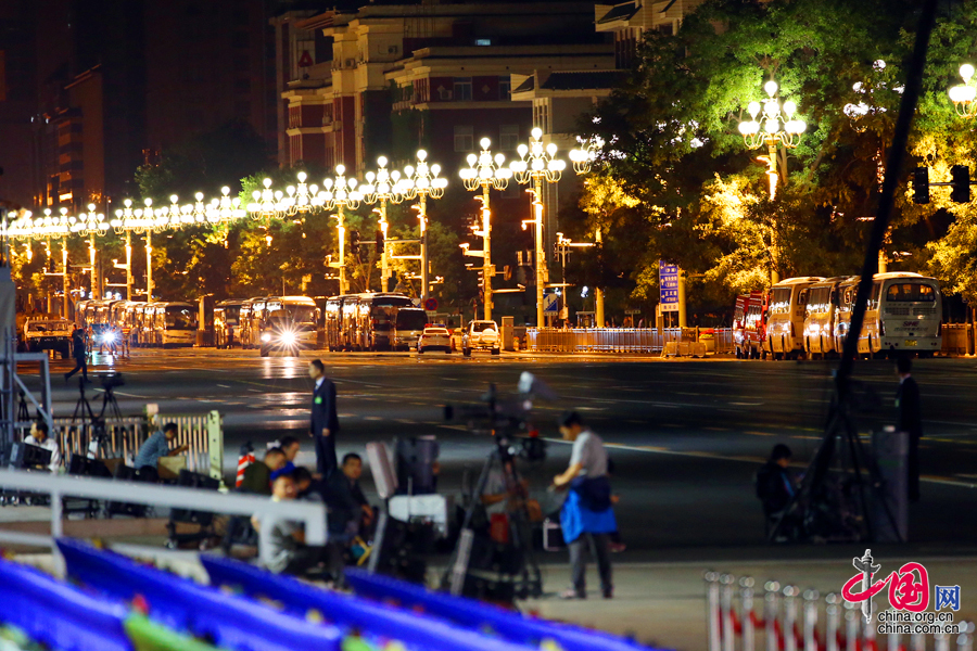 9月3日凌晨,天安門廣場的二中閱兵區(qū)域進(jìn)入最后的倒計(jì)時(shí)準(zhǔn)備階段。圖為等待閱兵方隊(duì)通過的長安街。中國網(wǎng)記者 鄭亮 攝