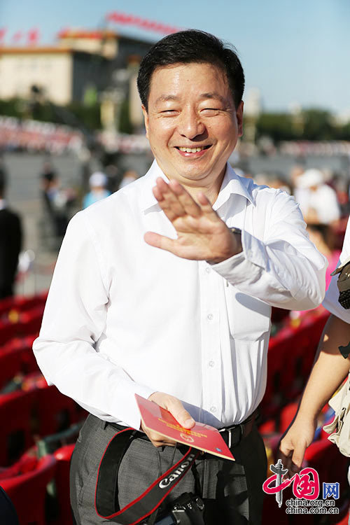 9月3日,中國人民抗日戰爭暨世界反法西斯戰爭勝利70周年紀念大會即將開始,嘉賓陸續到達。圖為中國外文局局長周明偉抵達現場。中國網記者 鄭亮 攝