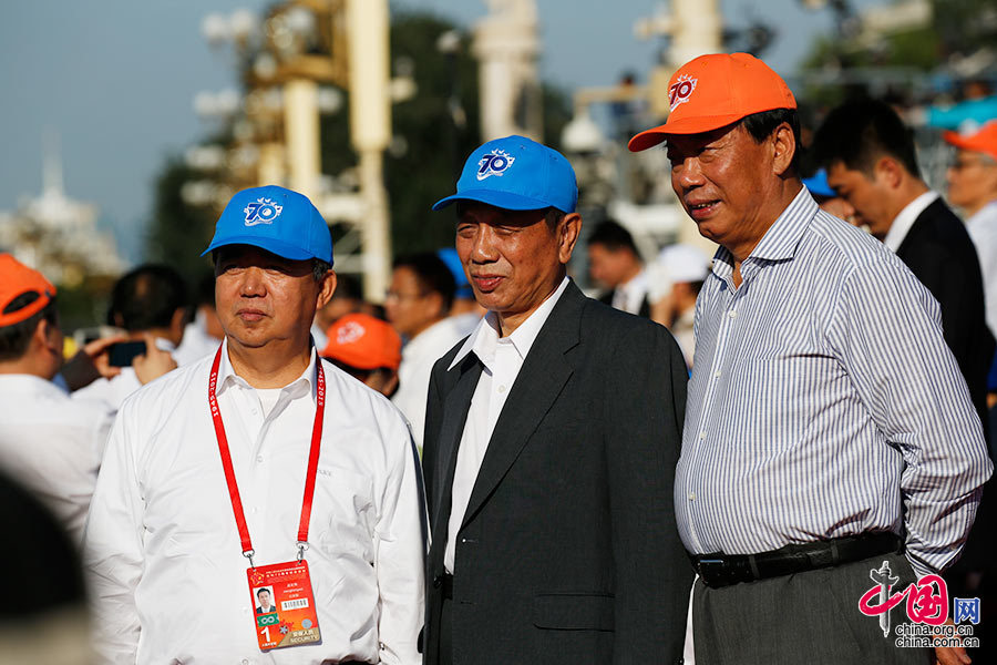 9月3日,中國人民抗日戰爭暨世界反法西斯戰爭勝利70周年紀念大會即將開始,嘉賓陸續到達。圖為嘉賓進行合影。中國網記者 楊佳 攝