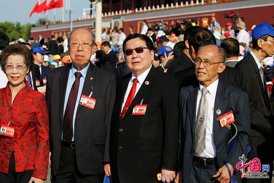 9月3日,中國人民抗日戰(zhàn)爭暨世界反法西斯戰(zhàn)爭勝利70周年紀念大會即將開始,嘉賓陸續(xù)到達。圖為嘉賓進行合影。中國網(wǎng)記者 楊佳 攝
