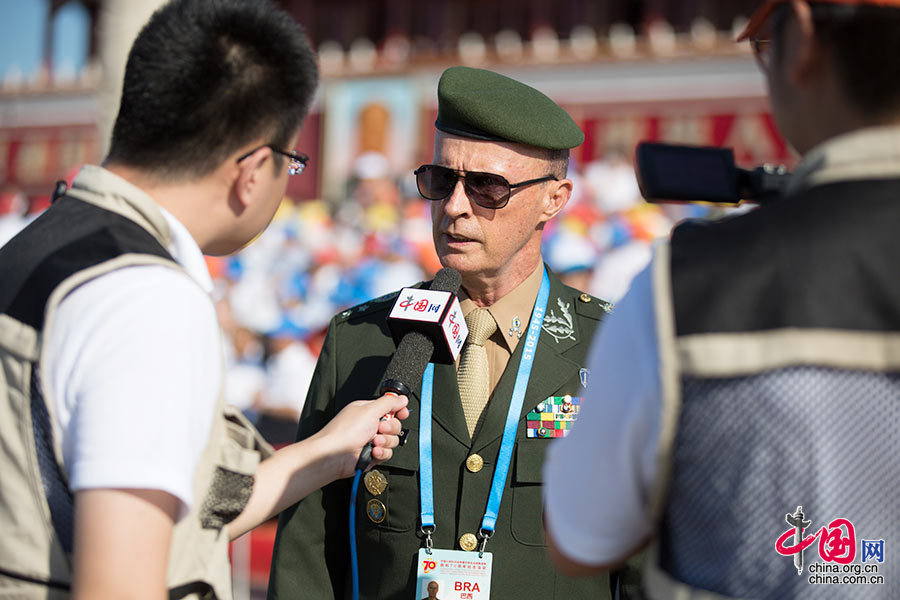 9月3日,中國人民抗日戰爭暨世界反法西斯戰爭勝利70周年紀念大會即將開始,嘉賓陸續到達。圖為嘉賓接受中國網記者采訪。中國網記者 鄭亮 攝