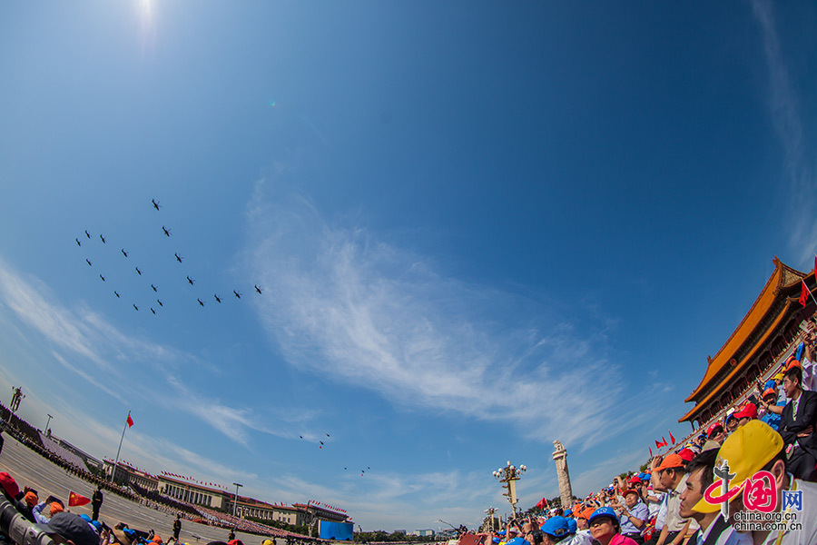 9月3日,中國人民抗日戰(zhàn)爭暨世界反法西斯戰(zhàn)爭勝利70周年紀念大會在北京隆重舉行。圖為空中護旗方隊接受檢閱。中國網(wǎng)記者 鄭亮 攝