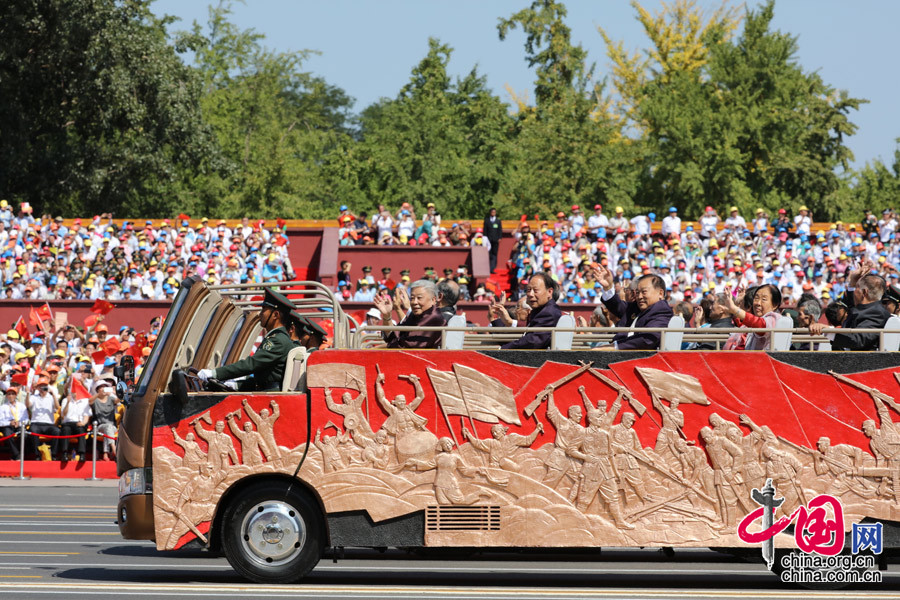 9月3日,中國人民抗日戰爭暨世界反法西斯戰爭勝利70周年紀念大會在北京隆重舉行。圖為抗日英雄子女乘車方隊。中國網記者 董寧攝影