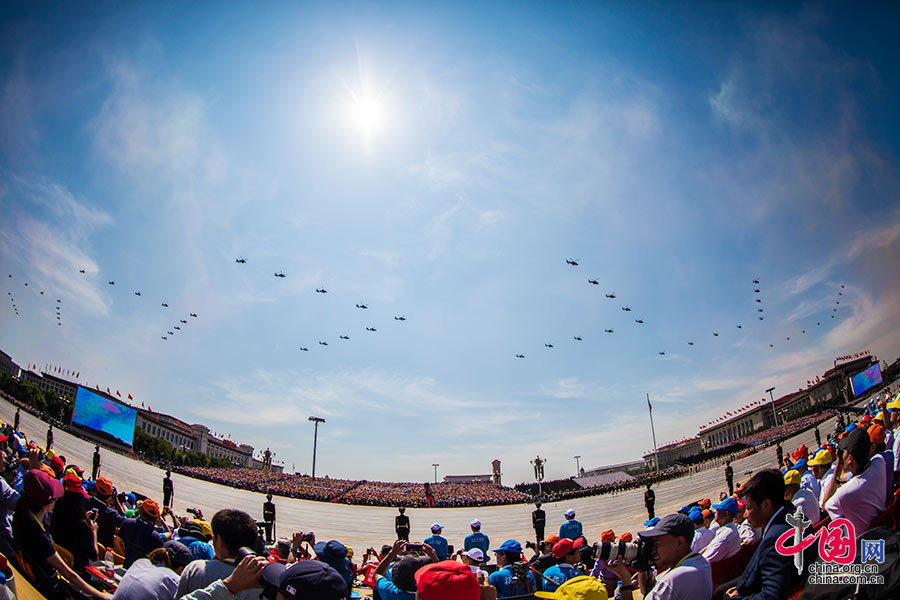 9月3日,中國(guó)人民抗日戰(zhàn)爭(zhēng)暨世界反法西斯戰(zhàn)爭(zhēng)勝利70周年紀(jì)念大會(huì)在北京隆重舉行。這是直升機(jī)梯隊(duì)接受檢閱。中國(guó)網(wǎng)記者 鄭亮 攝