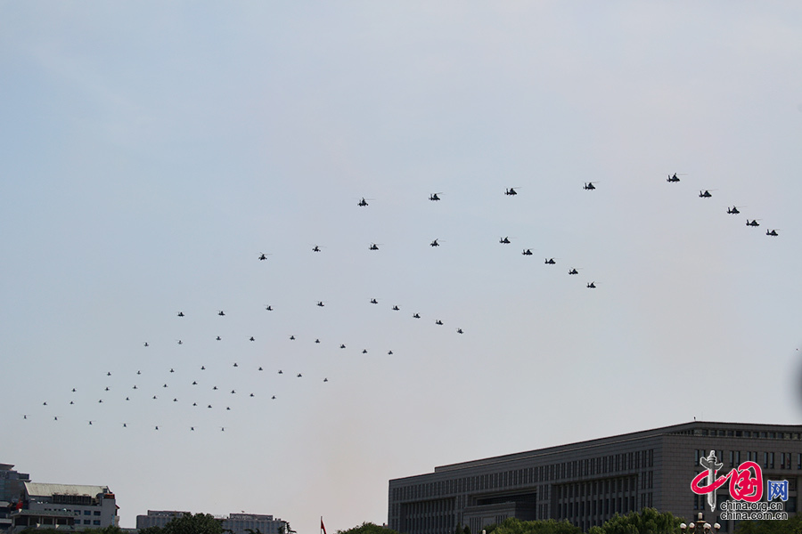 9月3日,中國人民抗日戰爭暨世界反法西斯戰爭勝利70周年紀念大會在北京隆重舉行。這是直升機梯隊接受檢閱。中國網記者 楊佳 攝