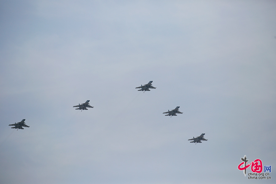 9月3日,中國人民抗日戰(zhàn)爭(zhēng)暨世界反法西斯戰(zhàn)爭(zhēng)勝利70周年紀(jì)念大會(huì)在北京隆重舉行。圖為艦載機(jī)梯隊(duì)接受檢閱。中國網(wǎng)記者 楊佳 攝