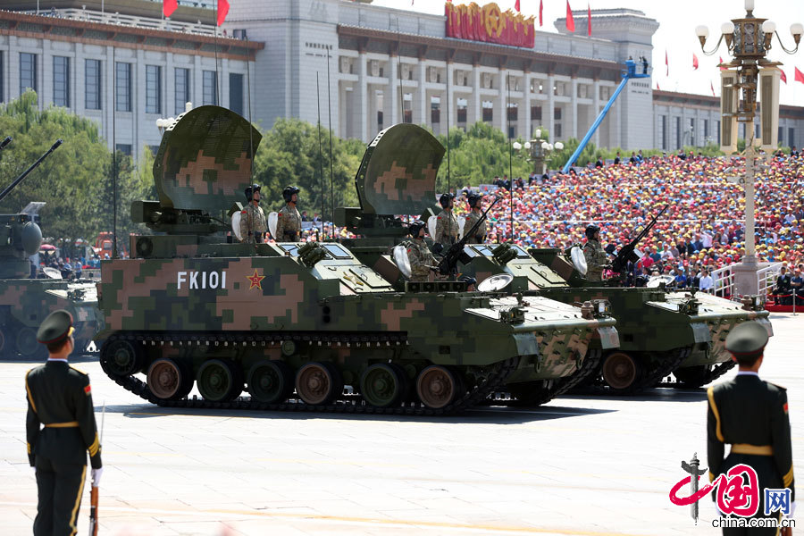 9月3日,中國人民抗日戰爭暨世界反法西斯戰爭勝利70周年紀念大會在北京隆重舉行。這是高射炮兵方隊接受檢閱。