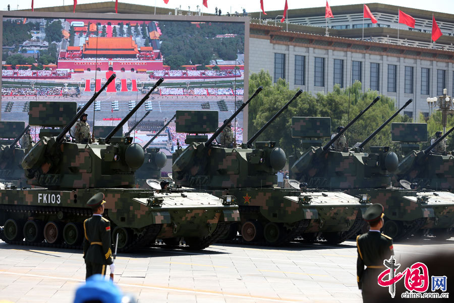 9月3日,中國人民抗日戰爭暨世界反法西斯戰爭勝利70周年紀念大會在北京隆重舉行。這是高射炮兵方隊接受檢閱。