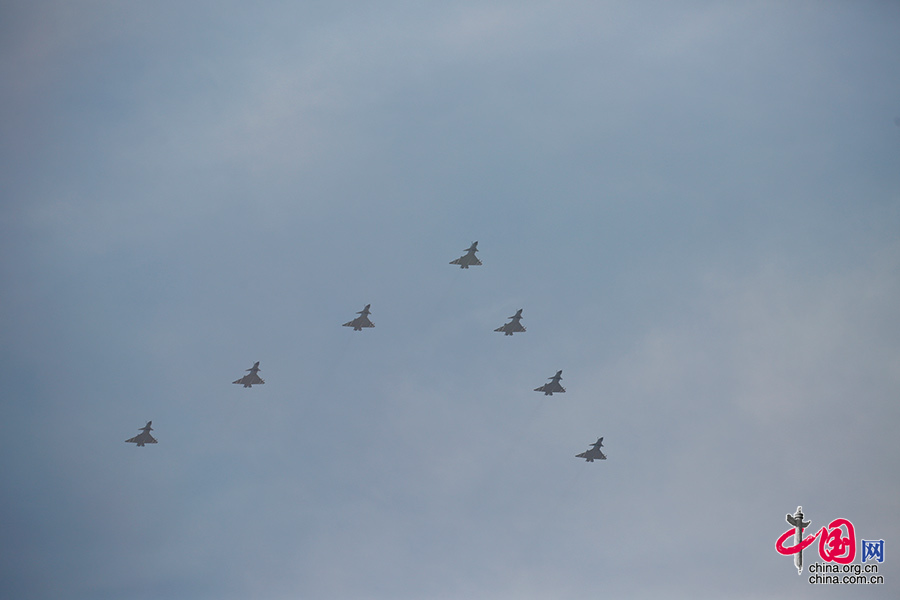 9月3日,中國人民抗日戰爭暨世界反法西斯戰爭勝利70周年紀念大會在北京隆重舉行。圖為殲擊機第二梯隊接受檢閱。中國網記者 楊佳 攝