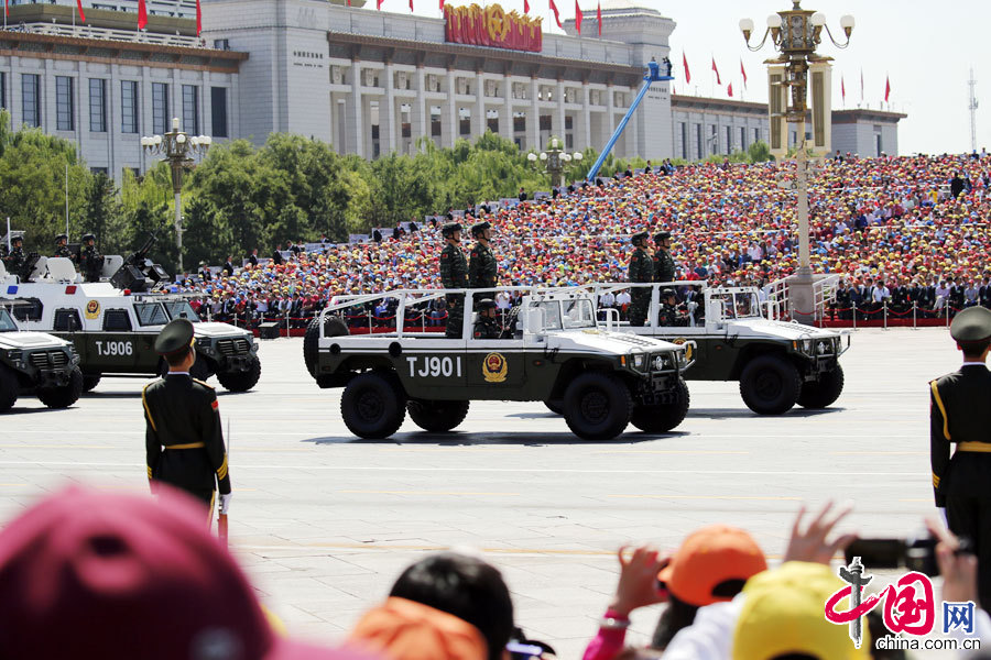 9月3日,中國人民抗日戰爭暨世界反法西斯戰爭勝利70周年紀念大會在北京隆重舉行。武警反恐突擊車方隊接受檢閱。