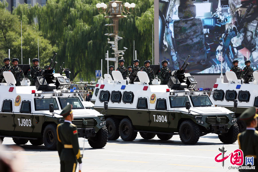 9月3日,中國(guó)人民抗日戰(zhàn)爭(zhēng)暨世界反法西斯戰(zhàn)爭(zhēng)勝利70周年紀(jì)念大會(huì)在北京隆重舉行。武警反恐突擊車(chē)方隊(duì)接受檢閱。中國(guó)網(wǎng)鄭亮攝影