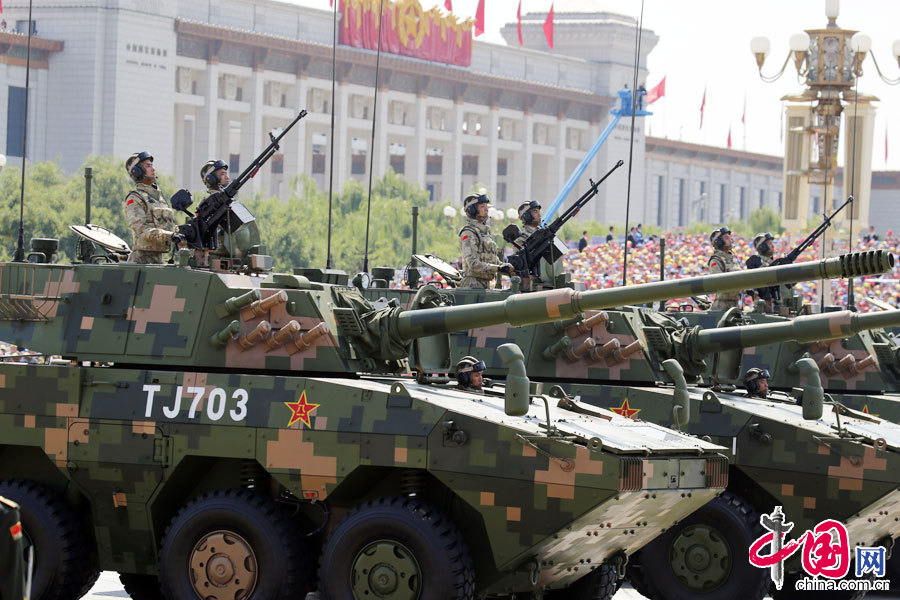 9月3日,中國人民抗日戰爭暨世界反法西斯戰爭勝利70周年紀念大會在北京隆重舉行。輪式裝甲突擊車方隊接受檢閱。