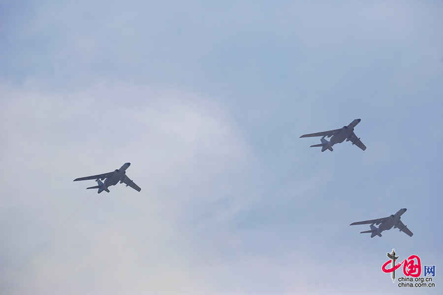 9月3日,中國人民抗日戰(zhàn)爭暨世界反法西斯戰(zhàn)爭勝利70周年紀念大會在北京隆重舉行。圖為轟炸機梯隊接受檢閱。中國網(wǎng)記者 楊佳 攝