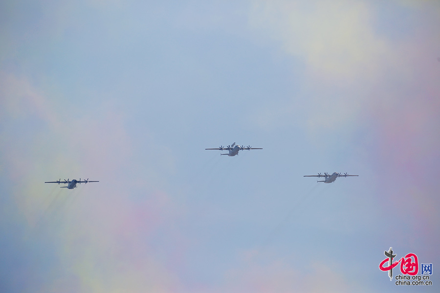 9月3日,中國(guó)人民抗日戰(zhàn)爭(zhēng)暨世界反法西斯戰(zhàn)爭(zhēng)勝利70周年紀(jì)念大會(huì)在北京隆重舉行。圖為海上巡邏機(jī)梯隊(duì)接受檢閱。中國(guó)網(wǎng)記者 楊佳 攝
