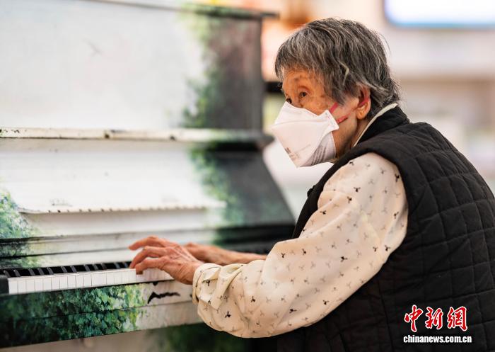 圖為年逾九旬的施美娥老奶奶在香港北區醫院的大廳演奏鋼琴。 中新社記者 侯宇 攝